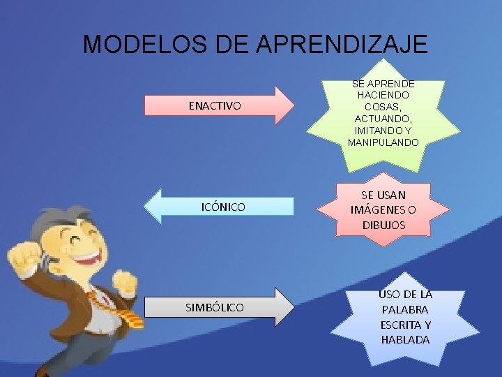 Para Bruner el aprendizaje es activo, teniendo el individuo una estructura cognitiva basada en la asociación con los conocimientos previos que le permite construir conocimiento y realizar inferencias. La representación de la realidad que se realiza mediante la cognición puede adquirirse de tres maneras o modos, empleados en diferentes momentos evolutivos del desarrollo debido a la necesidad de recursos cognitivos suficientes según se van complicando. Dichos modos de representación no son excluyentes entre sí, pudiéndose aplicar varios a la vez para facilitar el aprendizaje. Las tres modalidades de representación en una secuencia: